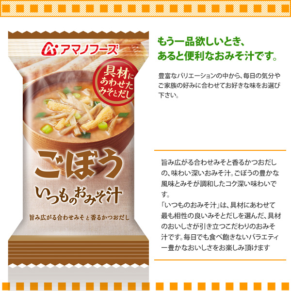 ![]() | アマノフーズ フリーズドライ味噌汁 いつものおみそ汁 ごぼう 9g×10食セット |