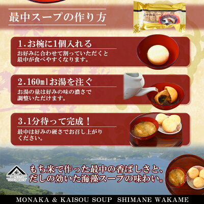 インスタント 山陰プレミアム のど黒だし使用 最中海藻スープ 6個入 原材料:もち米(国産)、椎茸粉末、食塩、醤油粉末、ぶどう糖、酵母エキス、蛋白加水分解物(小麦・大豆・豚肉を含む)、デキストリン、具(わかめ(島根県産)、茎わかめ(島根県産)、昆布(国産)、ふのり(国産)、ねぎ(国産))、かつお節粉末、昆布粉末、のど黒粉末、砂糖