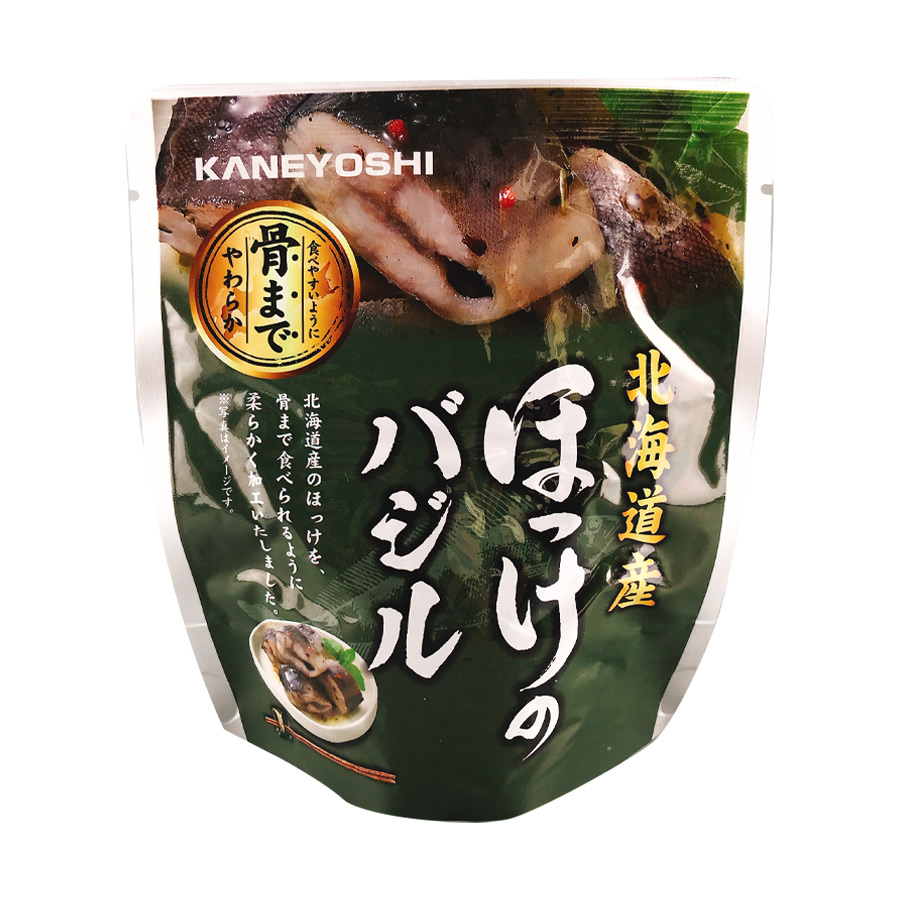 北海道沖で漁獲された鮮度の良いほっけを原料に使用し、バジルベースの兼由独自の調味液で味付けし、骨まで食べられるようじっくり煮込んでおります。ごはんのおかずや、お酒のつまみにも最適です。 賞味期限:製造より2年 保存方法:高温多湿を避けて常温で保存 原材料:ほっけ(北海道)、食用なたね油、植物油脂、香味食用油、食塩、チキンコンソメ、ガーリック、こしょう、レッドベルペパー、バジル、パセリ、オレガノ/調味料(アミノ酸等)、乳化剤、香料、着色料(ニンジンカロチン、パプリカ色素)、(一部に小麦・大豆・鶏肉・豚肉・ごまを含む)