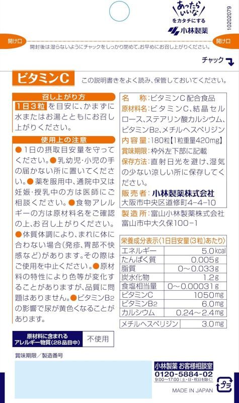 小林製薬の栄養補助食品 ビタミンC お徳用 約60日分 180粒 【海外発送可】 [B000V2FF5W]