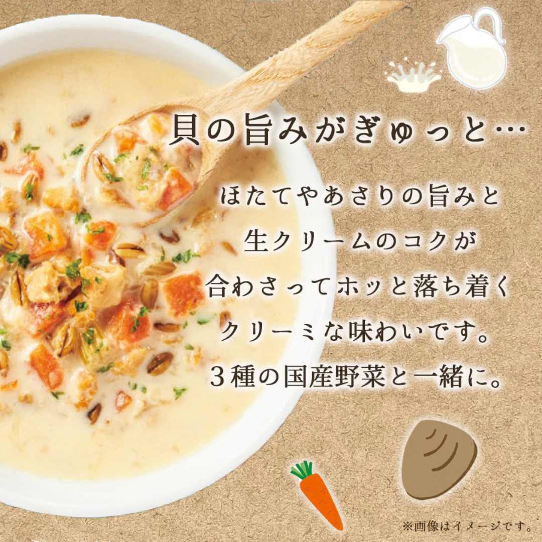 原材料:野菜(たまねぎ(国産)、にんじん、セロリ)、粉末油脂加工品、いたや貝柱、大麦、ほたてエキス、生クリーム、でん粉、乳等を主要原料とする食品、難消化性デキストリン、全粉乳、大豆油、砂糖、チキンエキス、酵母エキス、食塩、貝エキス、香辛料/乳化剤、(一部に乳成分・鶏肉を含む)