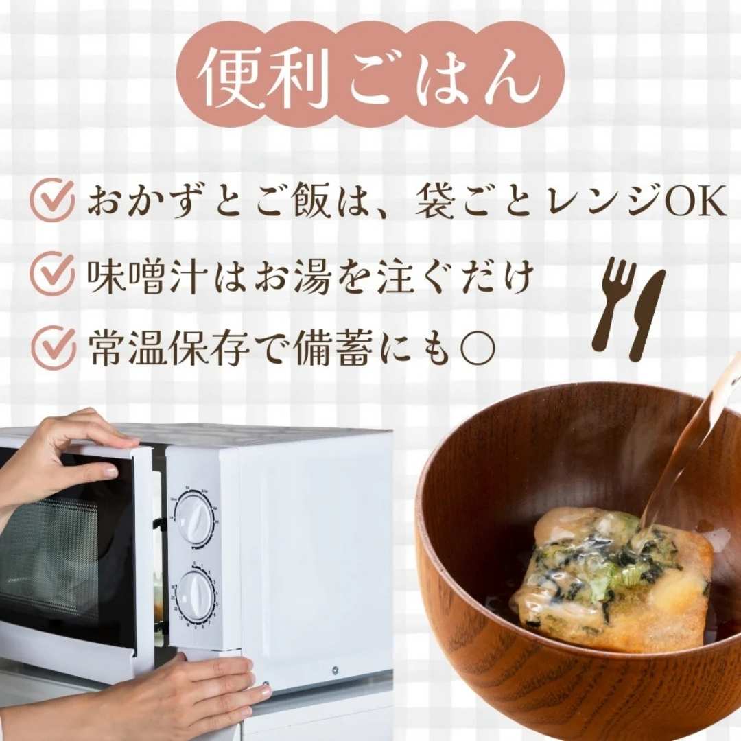 ご飯・味噌汁・おかずが全てセットになった、レンジとお湯で作れるお手軽セット!