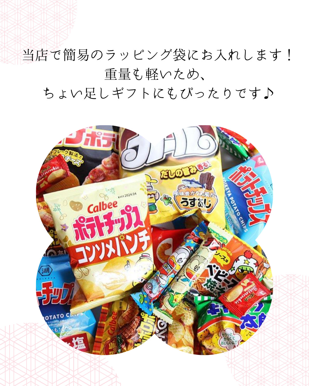 おかき、ポッキー、ポテトチップス、チョコ、グミなど