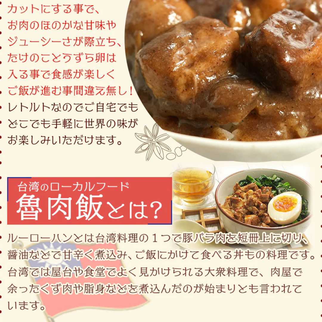 香辛料を少し抑えて食べやすいお味に。 (3)ルーロー飯のトッピングとして定番な卵が入っており、 この商品のみでご飯に載せれば満足度もバッチリ。 ※湯煎で5分ほど温めてお召し上がりください。