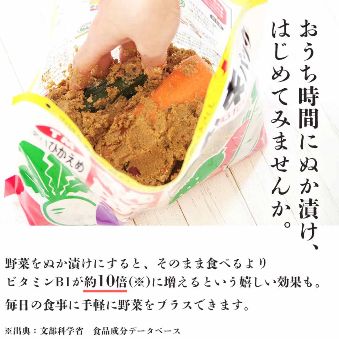 原材料:米ぬか(国内製造)、食塩、米みそ(大豆を含む)、還元水飴、米、からし、米麹、唐辛子、昆布、うこん/調味料(アミノ酸等)、酸味料