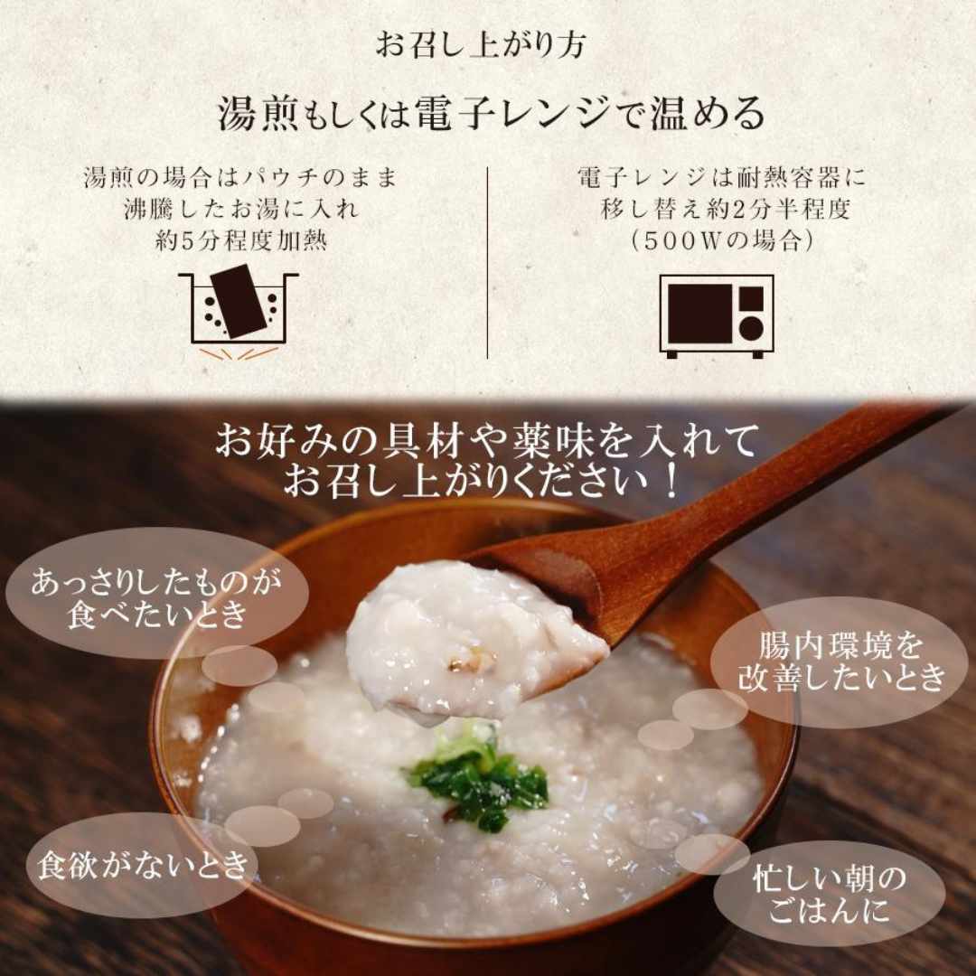 化学調味料、香料、保存料不使用の体に優しいお粥で、あたたかくてほっとするひと時を。