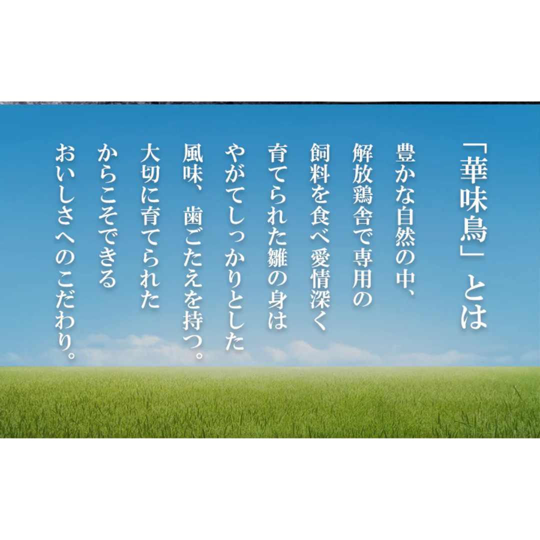 「華味鳥」とは。 愛情深く育てられた雛の身は、やがてしっかりとした風味、歯ごたえを持ちます。 創業明治15年、老舗の醤油醸造所製の濃口しょう油、 塩こうじ、麦すり味噌のコラボレーションが味に深みと旨味とコクを与えてくれています。