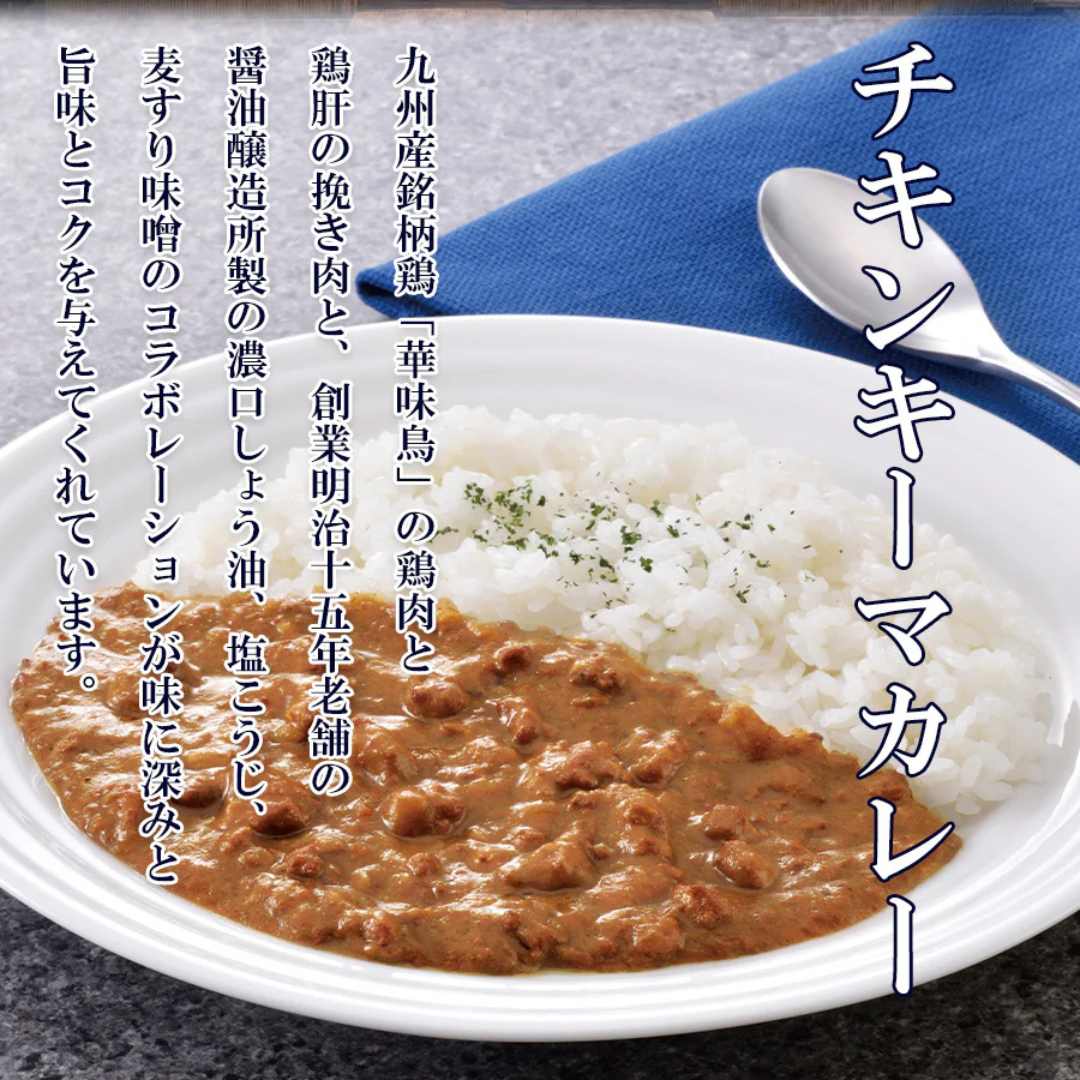 原材料:食肉等 [ 鶏挽肉(九州産)、鶏肝挽肉(九州産)]、 野菜(玉ねぎ、人参、生姜)、小麦粉、ソテーオニオン、ラード、鶏ガラスープ、砂糖、植物油脂、カレー粉、チキン調味エキス、しょうゆ、塩こうじ(米こうじ・食塩)、香辛料、食塩、リンゴピューレ、酵母エキス、フォンドボー、ポークエキス、味噌、おろしにんにく加工品、バター、たん白加水分解物/カラメル色素、乳化剤、調味料(アミノ酸)、(原材料の一部に小麦・乳成分・牛肉・ゼラチン・大豆・鶏肉・豚肉・りんごを含む)